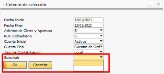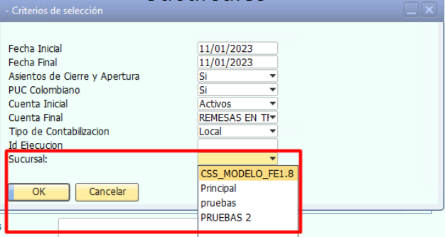 Como nueva funcionalidad se agrega el campo "Sucursales" el cual permite en los criterios de selección elegir la sucursal la cual se va a consultar: