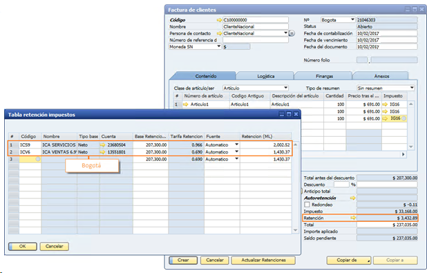 Al ingresar a la tabla de retención del documento, se observa la asignación de las retenciones parametrizadas al socio de negocio por el municipio Bogotá, sin embargo, la retención del municipio de "Girón" que también se parametrizó a este socio de negocio no es incluida, ya que este municipio no fue el configurado para el usuario que esta creando el documento.