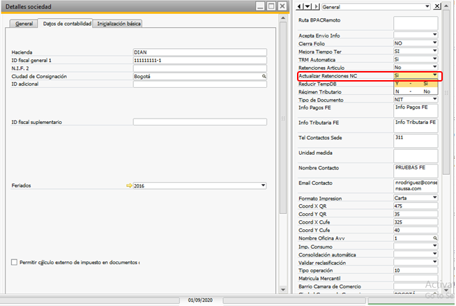 Con el fin de que las retenciones se apliquen en las Notas Crédito, y que se recalcule automáticamente el valor parcial o total de retenciones, se debe configurar en la sociedad, en la ruta Gestión/Inicialización del sistema/Detalles de la sociedad en los campos definidos por el usuario-Actualizar Retenciones NC se debe colocar Si