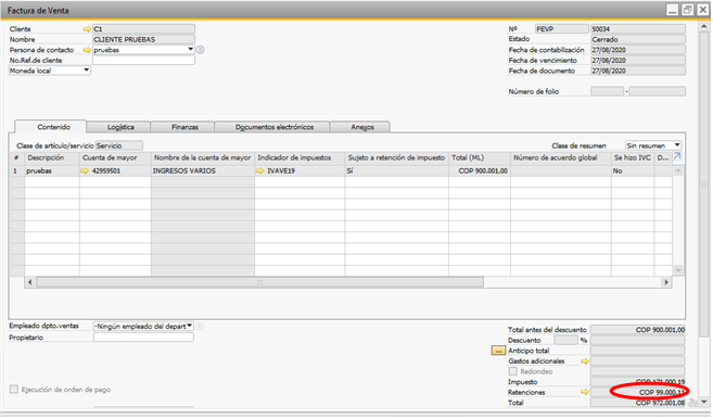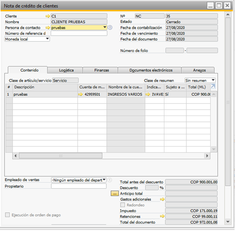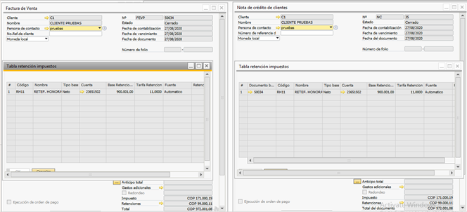 Como se puede observar la nota crédito trajo la misma retención asociada a la factura de clientes (documento origen); de igual forma el sistema cargara la misma base de retención en ambos documentos
