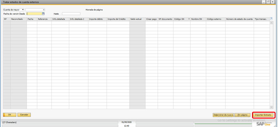 Para importar el extracto de cuenta externo automáticamente se debe ingresar a la ventana “Tratar estados de cuenta externos” de SAP Business One seleccionando Gestión de Bancos>Extractos bancarios y reconciliaciones externas>Tratar estados de cuenta externos. Se muestra la siguiente ventana: