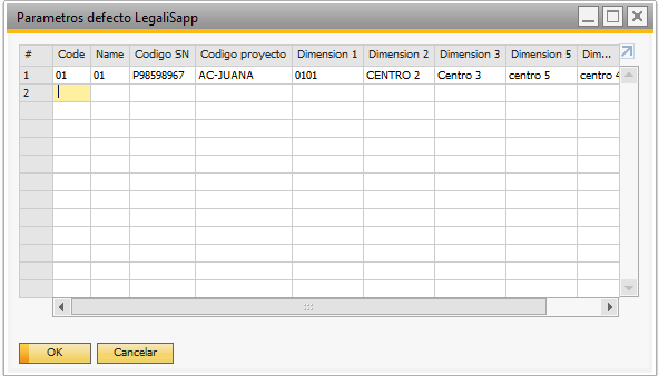 En esta ventana el usuario define la información por defecto que llevará cada perfil móvil que se crea, esta información corresponde a algunos datos de cabecera de legalizaciones y solicitud de legalizaciones que son necesarios para la creación de estos documentos. Esta parametrización es obligatoria, de no diligenciarse el aplicativo mostrará error al momento de sincronizar la información. Solo debe diligenciar una línea en la tabla.