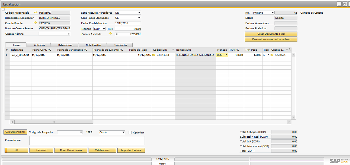 - Continúe el proceso normal de legalizaciones: Creación de documentos de línea y factura final.