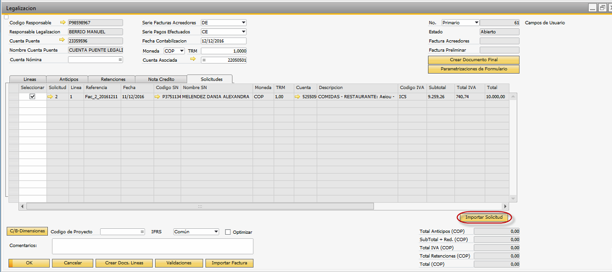 - La fecha de la solicitud debe ser inferior o igual a la fecha de la legalización, esto con el fin de evitar inconvenientes al momento de crear la legalización.