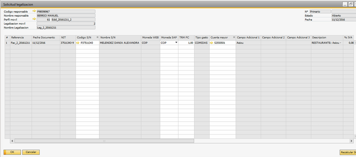 En la siguiente ventana puede ver una recopilación de la información parametrizada en la configuración, se carga toda la información referente a los perfiles móviles como lo son el responsable de la legalización, el proyecto, centros de costos, cuenta de mayor y la serie de la solicitud. Se carga también la información de los gastos definidos para el grupo del perfil y la información referente a impuestos y monedas.