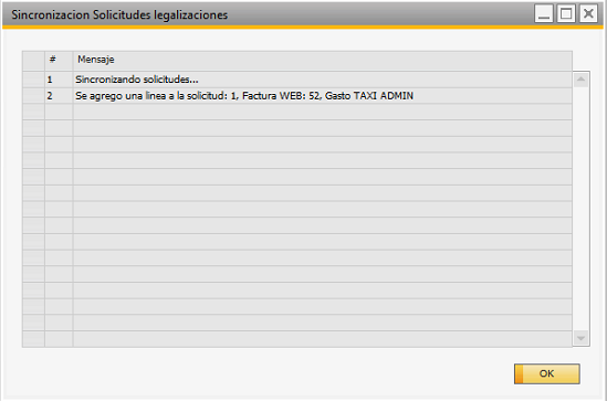Después de seleccionar la opción se mostrará en la ventana Sincronización solicitudes legalización la descripción de las solicitudes que se descargaron.