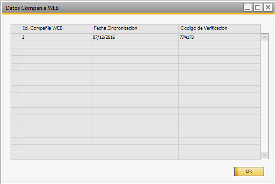 Después de que se sincronizan los datos maestros el sistema muestra en la ventana Datos compañía WEB la información correspondiente a la compañía que se registró en la nube.