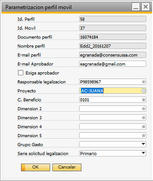Parametrice también los datos como responsable de la legalización, dimensiones, proyecto, grupo de gastos y serie de legalización que irá asociado a ese perfil en particular, con esta información se crean las solicitudes de legalización, además de que permiten filtrar las líneas de solicitud que se pueden asociar a una legalización.