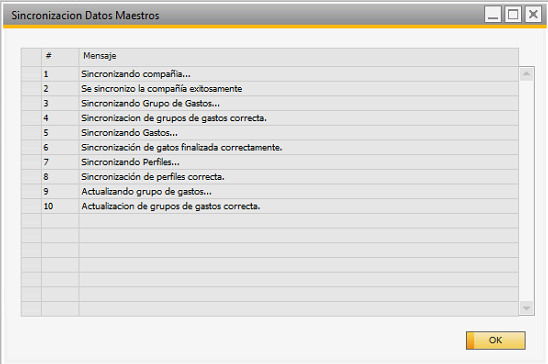 - La primer vez que sincroniza los datos maestros debe tener creado por lo menos un gasto