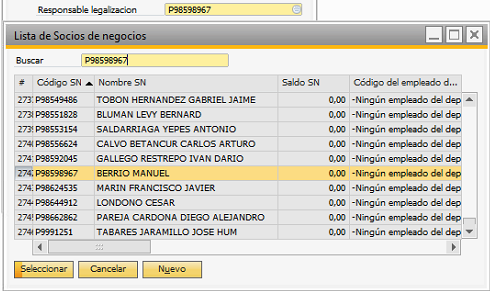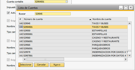 Seleccione una cuenta del plan de cuentas de SAP Business One. Esta cuenta es la que irá posteriormente a la linea de la legalización. |