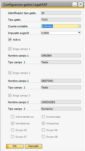 En esta ventana el usuario define los posibles gastos que puede seleccionar el usuario desde el móvil, esta información solo es configurable y editable desde SAP Business One.