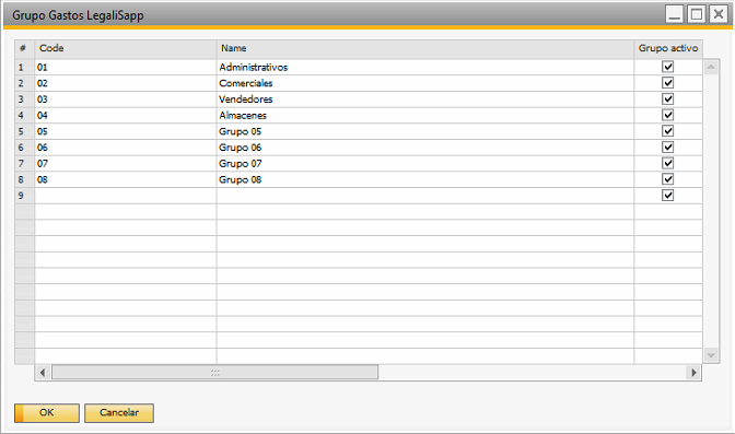 La funcionalidad de LegaliSAPP solo permite configurar hasta 8 gastos por facilidad de manejo y administración de los mismos. Por defecto en la tabla Grupo de Gastos LegaliSAP se crean los grupos desde el Grupo 01 hasta el Grupo 08, el usuario puede cambiar la descripción de cada grupo según como corresponda a su compañía.