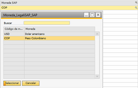 En esta ventana el usuario define las monedas que se listarán para los usuarios desde la aplicación móvil, el usuario ve la información del campo Moneda WEB, al seleccionar una de las monedas y después de la sincronización el sistema lleva automáticamente la moneda al campo Moneda SAP de la solicitud de legalización.