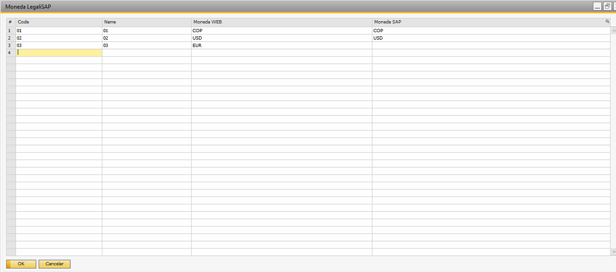 El sistema automáticamente carga las monedas que se ven en la siguiente imagen y el usuario debe configurar el código de moneda correspondiente al definido en SAP en el campo Moneda SAP, de igual modo puede agregar otros tipos de monedas.
