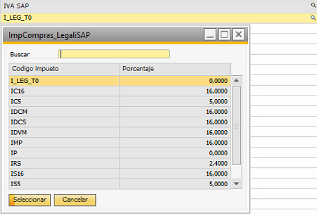 Es de tener en cuenta que al usuario móvil se le listarán los porcentajes definidos (campo IVA), si en la ventana Impuestos LegaliSAP no se tiene un código fiscal definido al momento de realizar la sincronización en la solicitud de legalizaciones el campo Código IVA quedará vacío.