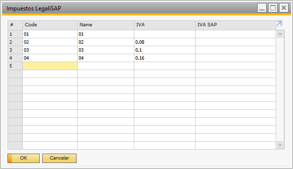 En esta ventana el usuario asocia los porcentajes de impuestos con los códigos fiscales definidos en SAP Business One, en la siguiente imagen se muestran los porcentajes que LegaliSApp crea por defecto, el usuario puede definir más porcentajes y asociar códigos fiscales a cada uno de ellos.