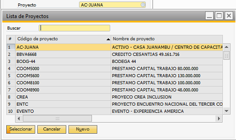 Nota: Proyectos y centros de costos (por dimensión activa en la compañía) para su diligenciamiento.