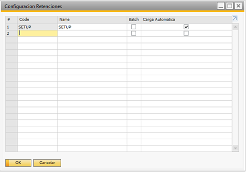 Los valores de los campos Code y Name vendrán por defecto una vez se cargue el AddIn Retenciones, seleccione el campo carga automática si desea calcular las retenciones en la factura automáticamente, seleccione el campo Batch si desea calcular las retenciones masivamente a través de un batch de documentos.