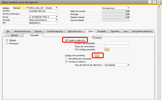Después de configurar la tabla de retenciones se debe asignar las retenciones correspondientes a cada SN (clientes y proveedores) para esto ir: datos maestros Socios de Negocio > Ficha finanzas > Ficha impuestos.