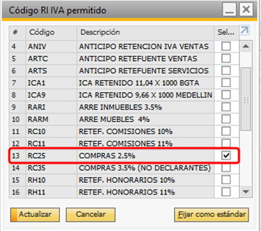 Seleccionar la opción sujeto de retención haciendo un clicK en "Sujeto a retención" y luego presionar el botón "...", seleccionar y verificar las retenciones correspondientes del Socio de Negocio Cliente y/o Proveedor de acuerdo con las configuraciones efectuadas de la tabla. Códigos retención de impuestos.