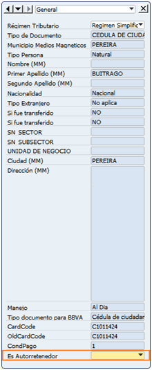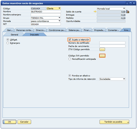 Después de configurar la tabla de retenciones se debe asignar las autorretenciones correspondientes a cada SN (clientes y proveedores) para esto ir: Socio de Negocio > Datos maestros socio de negocios > Ficha ‘finanzas’ > Ficha ‘impuestos’.