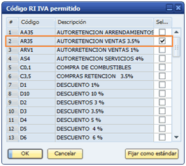 Seleccionar la opción sujeto de retención haciendo un clic en "Sujeto a retención" y luego presionar el botón "...", seleccionar la autorretenciones correspondientes del SN Cliente de acuerdo con las configuraciones efectuadas de la tabla. Códigos retención de impuestos.