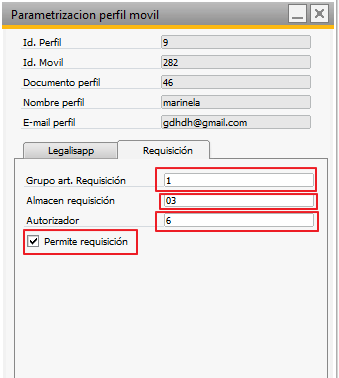 Una vez allí, se debe ingresar a la pestaña “Requisición”, es importante Habilitar el Check “Permite requisición” para poder realizar el correspondiente uso de esta funcionalidad así como configurar el correspondiente grupo de artículos, un almacén de requisición y el correspondiente autorizador. Para que el perfil de usuario pueda acceder a la funcionalidad de requisiciones. Por defecto, estos campos permanecen deshabilitados hasta tanto no sea marcado el check.