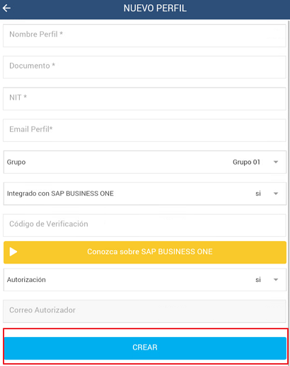 la aplicación muestra un formulario en el cual se deben diligenciar los datos básicos del perfil. Entre estos, debe especificarse el nit y código de verificación de la compañía. Para finalizar, se debe pulsar el botón "CREAR".