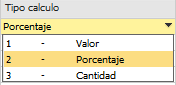 Seleccione si el tipo de cálculo estará basado en el porcentaje, valor o cantidad