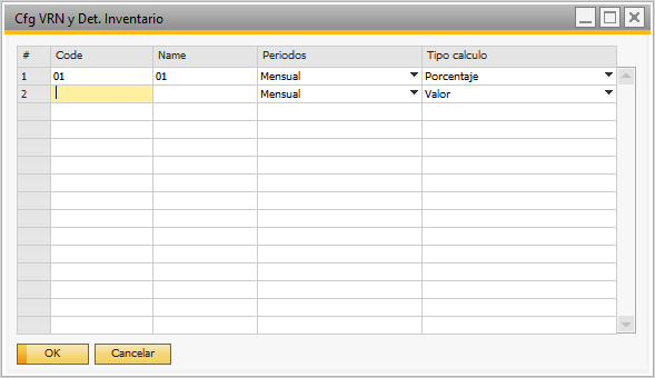 Ruta: Herramientas -> Ventanas definidas por usuario -> OK1_CFG_VRN_DI – Cfg VRN y Det. Inventario.