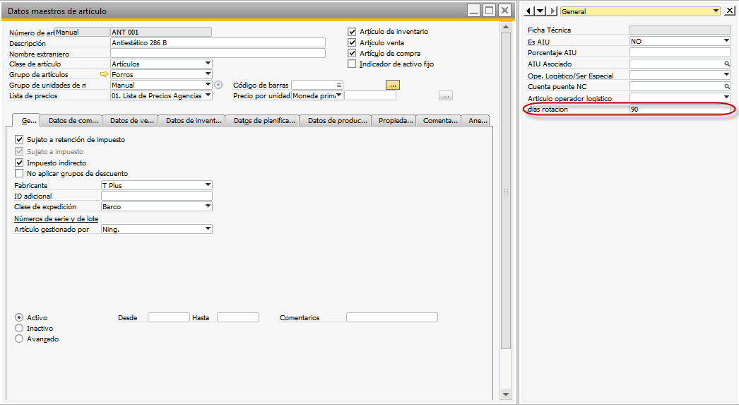 Debe configurar en el campo ‘días rotación’ del articulo el número de días de rotación del mismo.