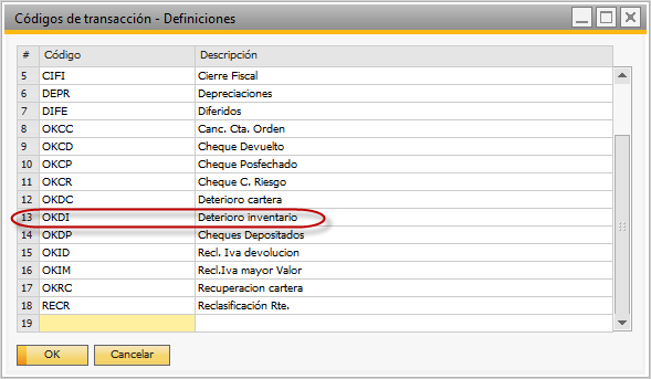 Debe tener configurado el código de transacción “OKDI” “Deterioro inventario” en la ruta desde el menú principal de SAP: Gestión -> Definiciones -> Finanzas -> Códigos de Transacción