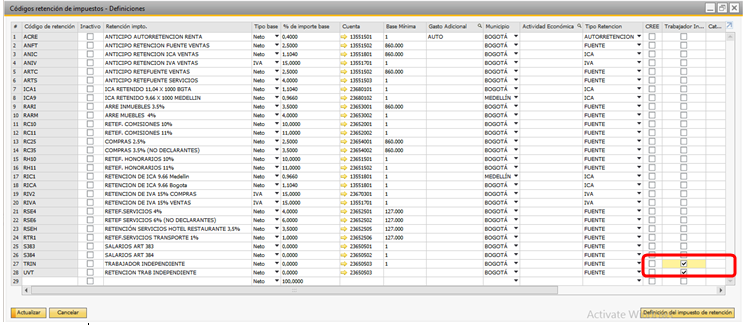 En esta tabla se debe crear el código correspondiente para la Retención en la fuente para Trabajador Independiente: