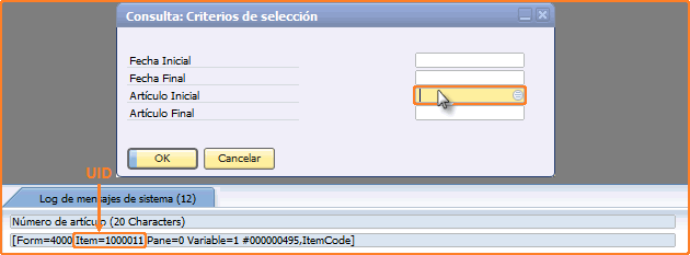Una vez activada la información del sistema, coloque el puntero de mouse sobre el cuadro de texto; en la parte de inferior de SAP Business One, aparecerá la información interna del cuadro de texto, tal y como se muestra en la imagen.