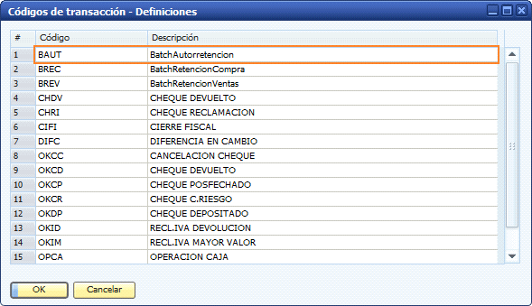 Gestión > Definiones > Finanzas > Códigos de transacción: