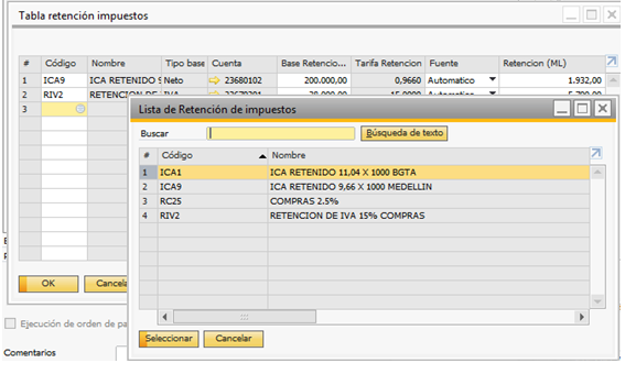 Si no seleccionó ninguna de las opciones de carga de retenciones (Carga Automática o Batch), significa que asignará las retenciones manualmente, por lo tanto cuando cree los documentos deberá indicar que retenciones aplicará al documento.