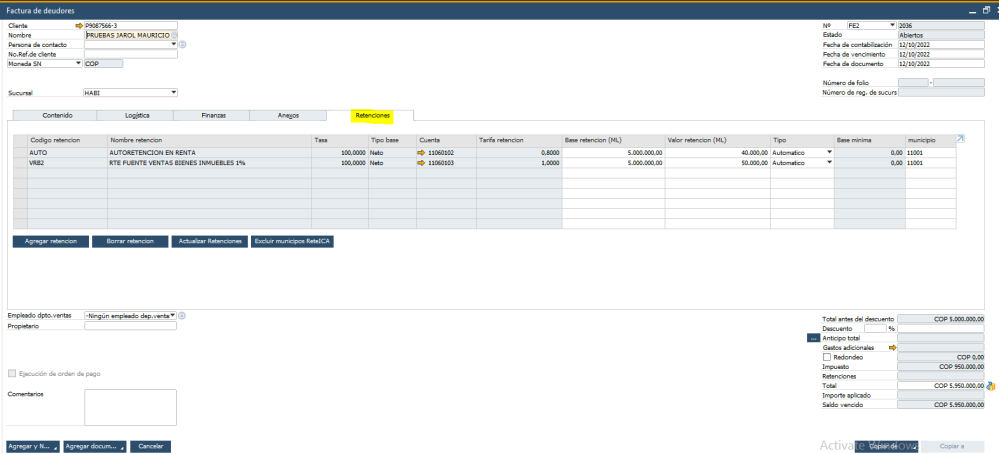 NOTA: Los datos de la pestaña de retenciones, se borran despues de que se crea la factura de deudores. Para visualizarlos se debe ingresar a la tabla IR de retenciones.