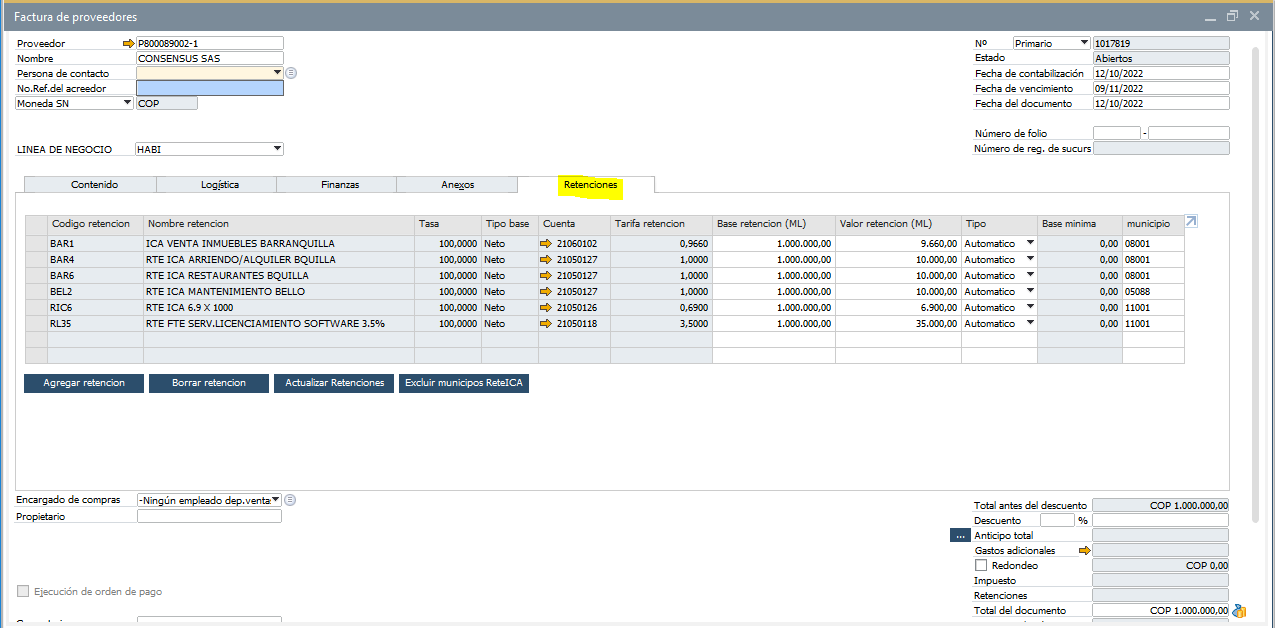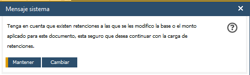 Después a que se carguen las retenciones en dicha pestaña, el usuario puede modificar las bases de retención y aparecerá un mensaje de advertencia si desea mantener los valores modificados o si por el contrario debe verificar de nuevo la base de retención.