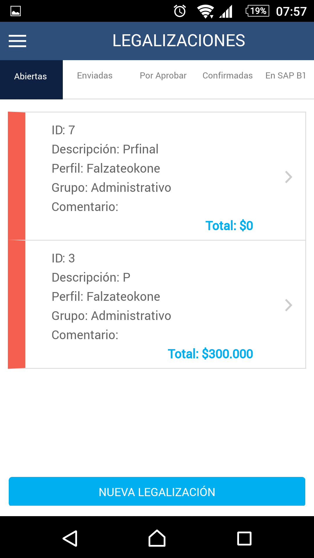 la legalización en pestañas abiertas con el comentario del aprobador. Este podrá hacer las modificaciones necesarias y volver a enviar la legalización. Luego de aprobada una legalización esta cambia a la pestaña "Confirmadas" en el perfil creador.