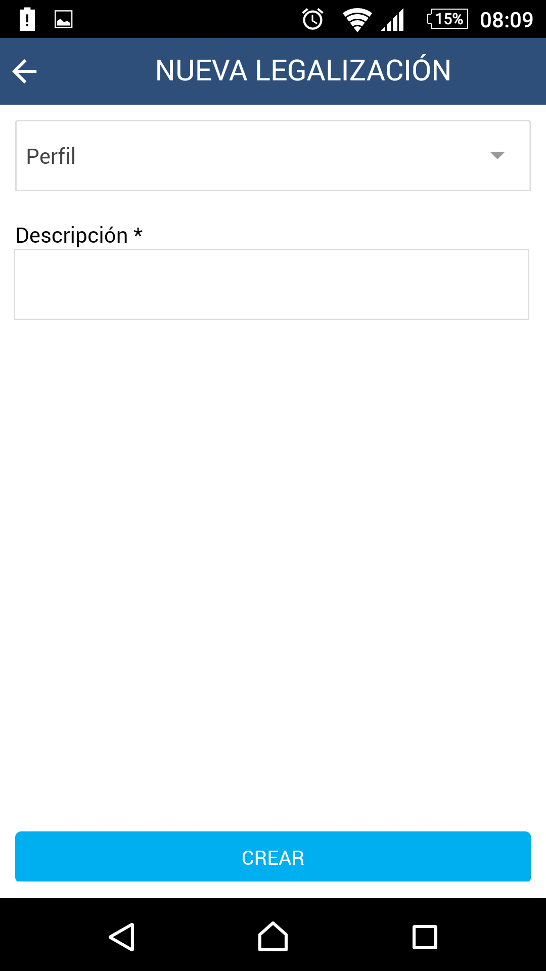 1. Seleccione Nueva Legalización. Seleccione el perfil con el que creara la legalización e ingrese un titulo o descripción para la legalización. Luego de ingresados estos datos, seleccione crear.