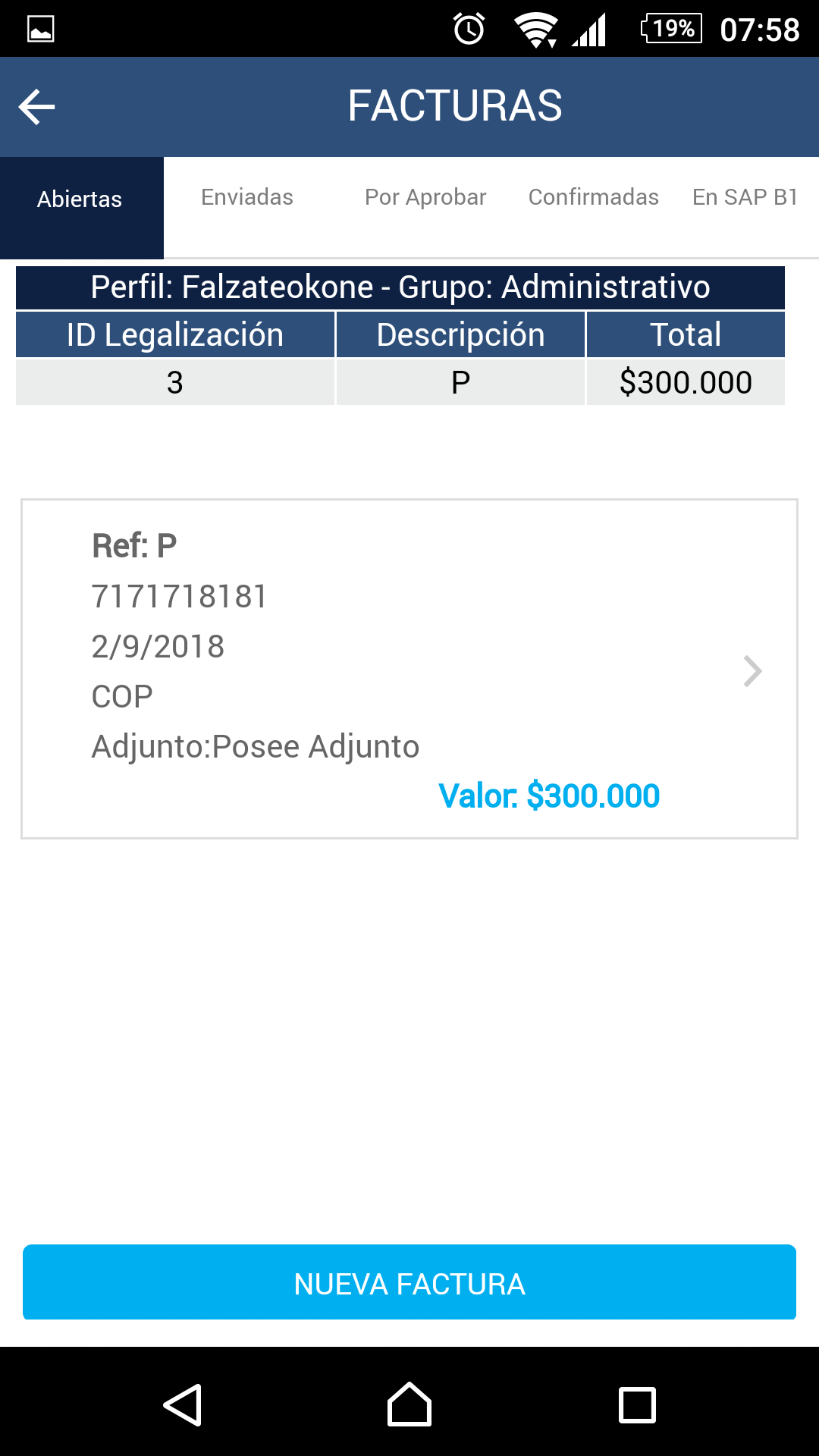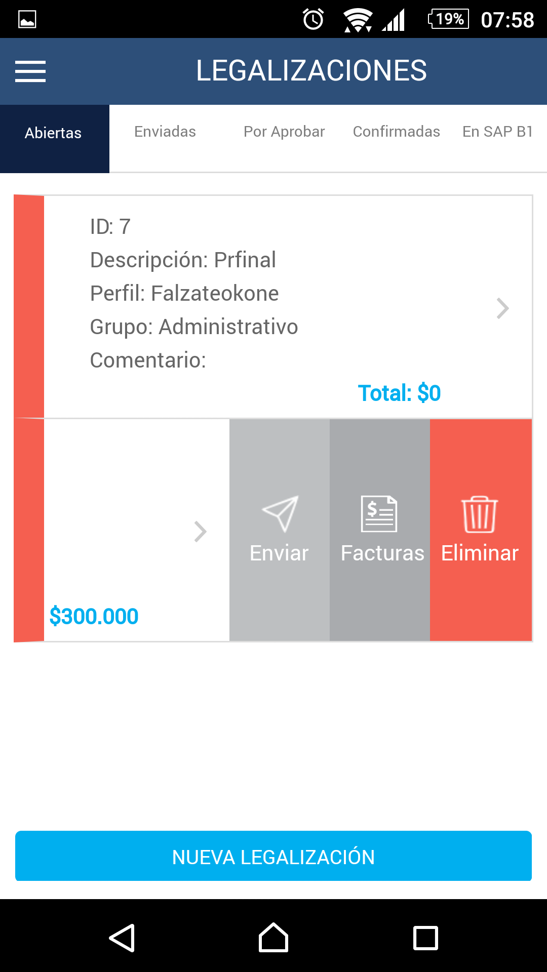 3. Enviar Legalización: Luego de haber creado las facturas, ya podrás enviar las legalizaciones, deslizando hacia la izquierda la legalización: