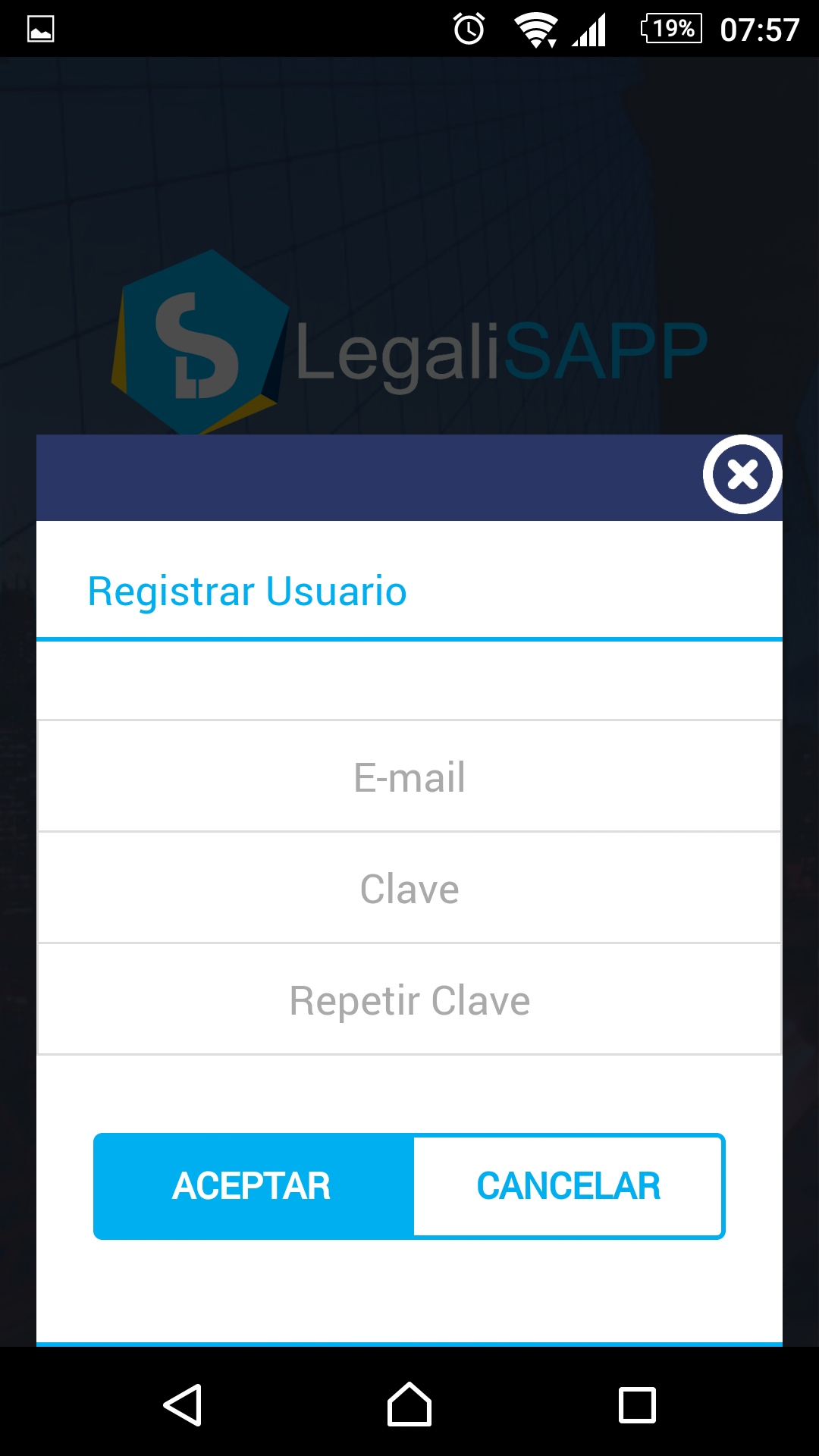 Para la creación de un usuario seleccione Registro. Allí sólo deberá de ingresar un usuario, una contraseña y confirmarla y automáticamente se creará y se asignarán los perfiles, legalizaciones y requisiciones alojadas en el móvil al usuario creado. Esto con el fin de que se puedan recuperar toda la información en caso de que se des-instale la aplicación.