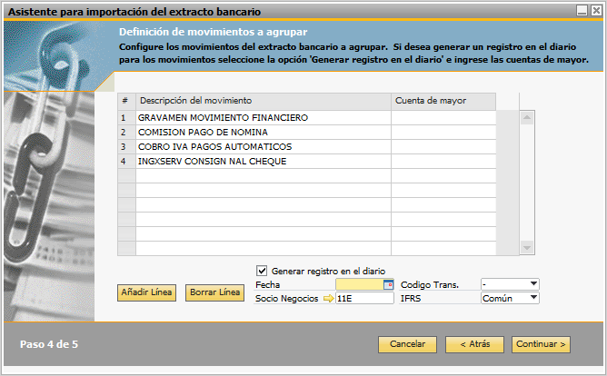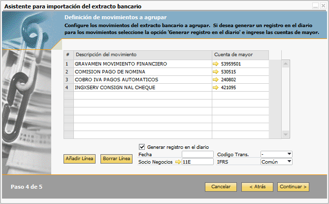 En este paso también puede especificar que para todos los movimientos agrupados se cree un registro en el diario seleccionando la opción “Generar registro en el diario” e ingresando la cuenta de mayor (que equivale a las cuentas de gastos bancarios) para cada movimiento, el código del socio de negocios que aparecerá en el registro en el diario, la fecha con la que se generará el registro en el diario y el código de transacción. Los campos Fecha y Código Trans. son opcionales, el campo Socio Negocios se exigirá cuando exista el campo para manejo de terceros “U_InfoCo01”. El campo IFRS establece por cual tipo de IFRS se va a establecer el registro de diario a crear.
