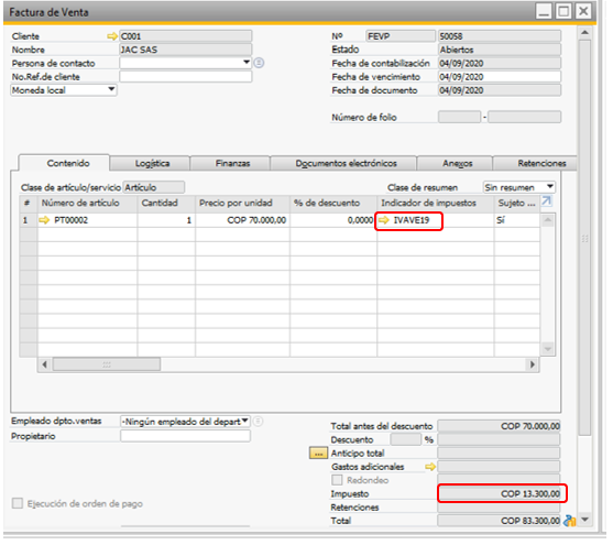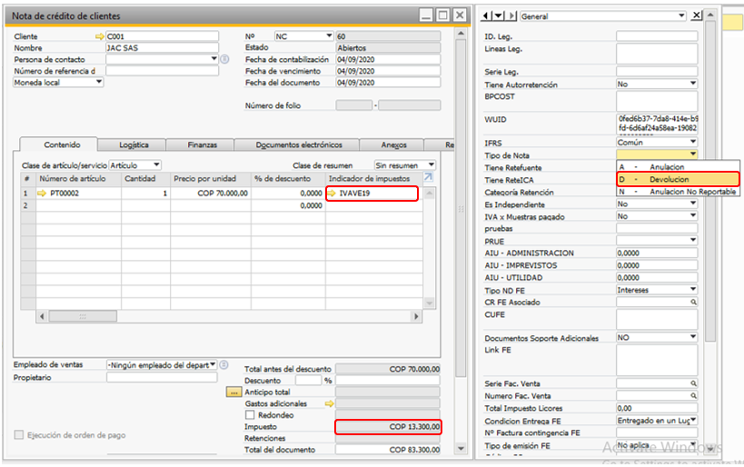 Al realizar la factura de clientes correspondiente por clase de articulo/servicio, debe seleccionar el código de IVA, parametrizado con la cuenta de devolución.