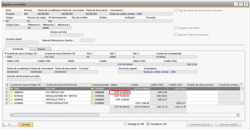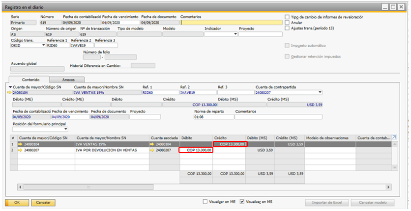 Código de transacción: OKID – Reclasificación IVA Devolución. – que se reversa en la nota crédito.