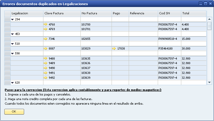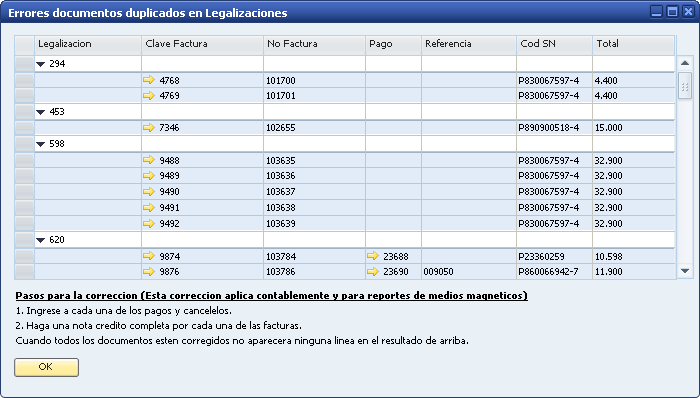 En esta pantalla se muestran las legalizaciones y las facturas que se encuentran duplicadas. Para solucionar el problema en cada legalización que muestra el informe, es necesario cancelar el pago relacionado para así poder hacer la nota de crédito de dicha factura por cada una. Si no hay pagos efectuados, solo se realiza la nota. En el caso de que hayan pagos relacionados, se hace el siguiente proceso:
