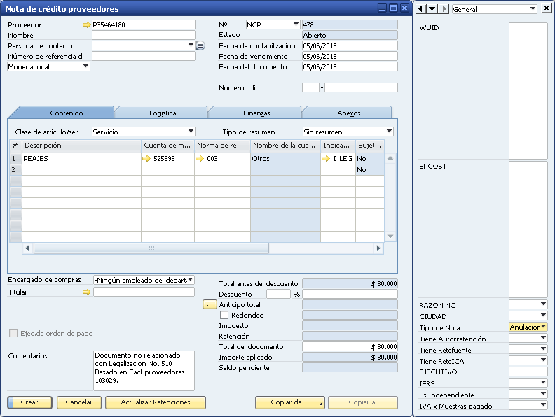 Después de hacer el cambio, se crea la Nota de Crédito sobre dicha factura. Antes de poder crear la factura, es importante seleccionar el Tipo de Nota.