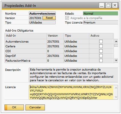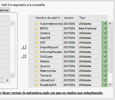 Esta opción ubicada en la parte izquierda del formulario permite visualizar todos los addIn disponibles para asignar a la compañía.