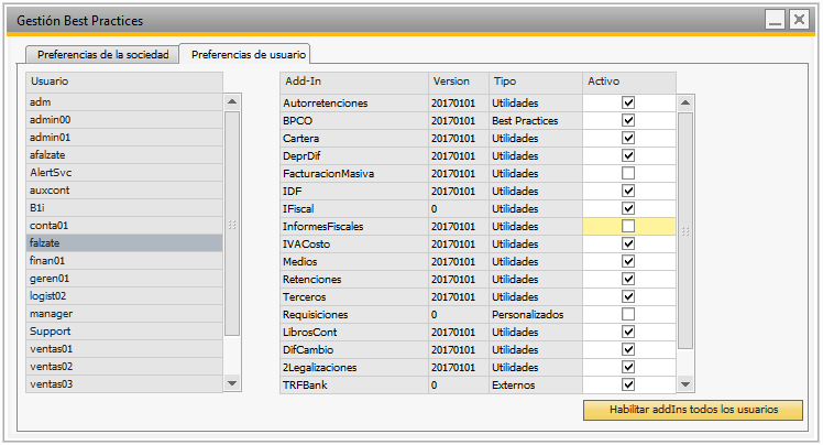 Esta ficha presenta todos los addin asignados a la compañía, con el fin de que el superusuario defina cuales desea que sean utilizados por cada usuario y cuáles no. A continuación se presenta la ficha.