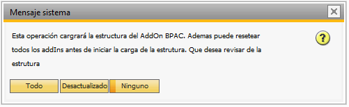 Todo Reinicia y carga la estructura de todos los Add-In asignados a la compañía y al usuario actualmente logueado. Desactualizado Reinicia y carga la estructura de los Add-In que han sido reiniciados o se encuentran desactualizados. Ninguno Cancela la opción |
